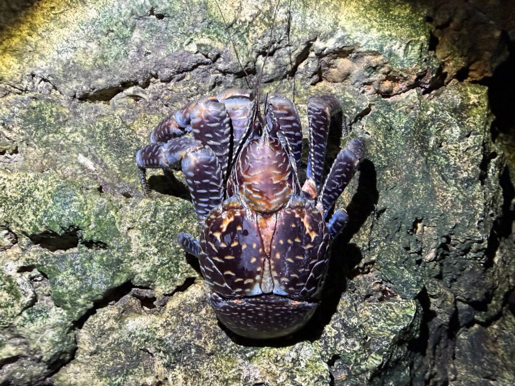 ヤシガニは甲殻類でありながらも、生活のほとんどが陸上を中心としております。